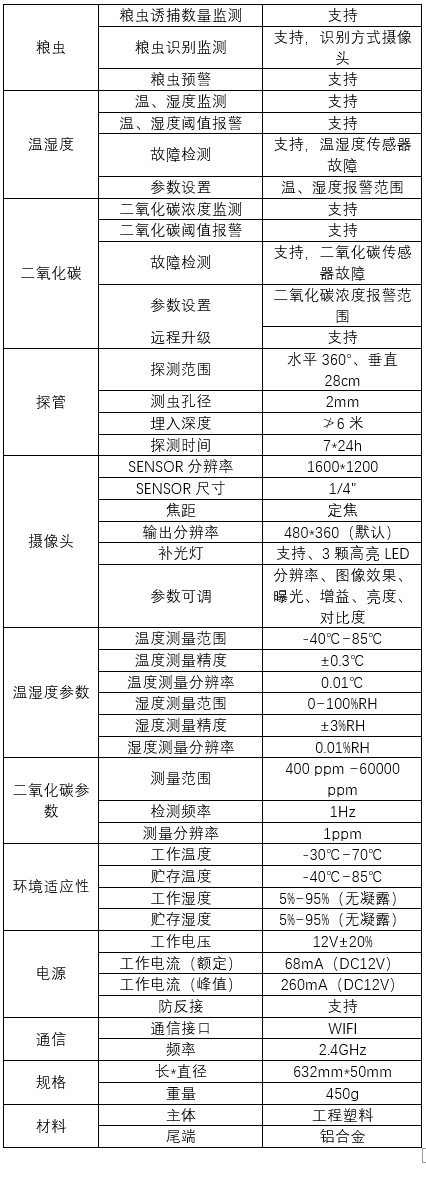 粮堆害虫诱捕识别传感器是基于探管式诱捕装置,其设计了流线型的外形结构、害虫掉落检测电路及摄像头、二氧化碳浓度检测传感器、自适应阈值的害虫红外光电序列数据采集架构,使该设备可以有效的插入粮堆深处并稳定、有效的检测点位上的害虫数量和害虫种类,以及检测二氧化碳浓度和温度.